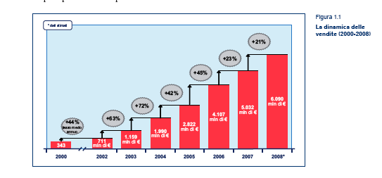 In apparenza si tratta di cifre incoraggianti che segnalano, peraltro, il consolidarsi di tendenze positive ormai invalse da anni: l’aumento dei volumi di vendita è continuato in maniera impetuosa per tutti gli anni 2000, con tassi di crescita annua sempre superiori al 20%.