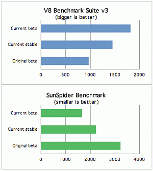 Come noto, seppure sia basato su WebKit, Chrome non ne utilizza il motore JavaScript: Google gli ha infatti preferito V8, una macchina virtuale sviluppata in Danimarca da un gruppo di specialisti ingaggiati da BigG. I suoi sviluppatori definiscono V8 il più veloce motore JavaScript esistente, ma dal suo debutto ad oggi la concorrenza non è rimasta a guardare: Apple, Mozilla e Opera stanno tutte lavorando a engine di nuova generazione capaci di migliorare nettamente le performance dei precedenti motori JavaScript, e anche Microsoft, il cui Internet Explorer 8 fino ad oggi non ha brillato in quanto a velocità, ha recentemente promesso che la versione finale fornirà gradite sorprese in tal senso.