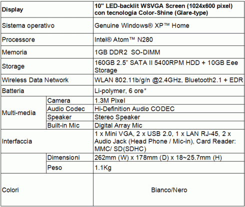 Sotto la scocca si trovano invece un processore Atom N280 a 1,66 GHz, 1 GB di RAM, disco rigido da 160 GB, moduli wireless WiFi 802.11n e Bluetooth 2.1, batteria a polimeri di litio da 2900 mAh capace di fornire un’autonomia dichiarata di 6 ore.