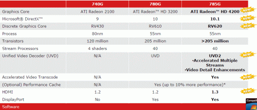 Buona parte delle novità fornite dal chipset 785G sono da attribuire alla nuova GPU integrata Radeon HD 4200, basata sul core RV620, che al pari della Radeon HD 3200 al cuore del 780G supporta le librerie DirectX 10.1 e la tecnologia Hybrid CrossFireX, che permette di sommare la potenza grafica della GPU integrata con quella di una scheda grafica PCIe compatibile.