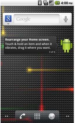 Nell’esaminare le novità di Froyo partiamo proprio da uno degli elementi che ha subito meno modifiche: la GUI. La Home (il “desktop” di Android) conserva una configurazione a cinque pagine e la stessa grafica della precedente, ma sul bordo inferiore dello schermo sono ora presenti, oltre al pulsante “dot matrix” per richiamare il menù delle applicazioni, anche i pulsanti Telefono e Browser: a differenza delle normali scorciatoie (shortcut), i due pulsanti integrati restano visibili in tutte le schermate della Home. Questa è per altro una modifica già vista sui Launcher alternativi che possono essere scaricati dall’Android Market, o da altri canali non ufficiali.
