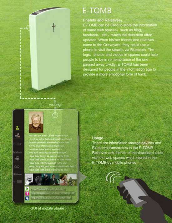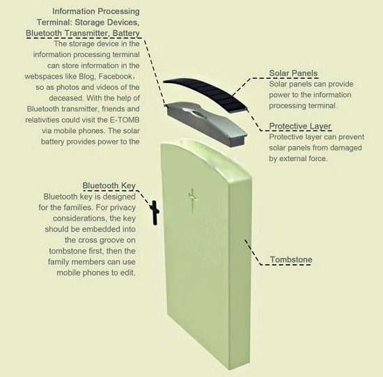 La tomba è in grado di immagazzinare le informazioni riguardanti i siti di social networking come Facebook e blog, le foto o i video relativi al defunto, permettendo così ad amici o parenti di rivivere la vita digitale della persona scomparsa attraverso i cellulari o i dispositivi portatili.