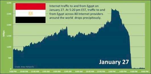 L’interruzione totale del servizio, durata mezz’ora, è un evento che, secondo gli esperti potrebbe accadere in un paese come l’Egitto ma non, ad esempio, negli Stati Uniti, grazie all’alto numero di fornitori di connettività e per la varie modalità di connessione disponibili oltroceano. “Non può accadere qui” spiega Jim Cowie, capo dell’ufficio tecnologie e cofondatore di Renesys, azienda che si occupa di sicurezza dei network con sede nel New Hampshire. Il blackout egiziano dimostra che un paese con un forte controllo sui provider può ordinare di staccare la spina improvvisamente, un evento che lo stesso Cowie definisce “quasi senza precedenti nella storia di Internet”.