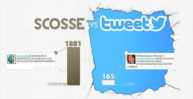 Il colosso pubblicitario Saatchi & Saatchi ha lanciato nei giorni scorsi scossevstweet.it , un portale in cui si disputava una sorta di “sfida” in tempo reale fra il numero delle scosse dello sciame sismico che ha colpito l’Emilia Romagna dal 20 maggio scorso e quello dei tweet postati attraverso l’hashtag #scossevstweet. Scatenando una polemica.