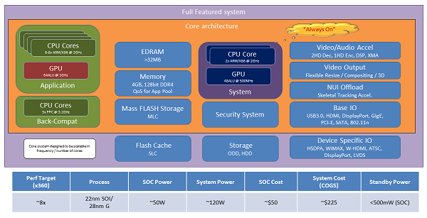 Secondo quanto riporta il documento, la console affiancherebbe a una CPU a 6-8 core ARM x86 da 2GHz una GPU da 64ALU a 1GHz su cui far girare le applicazioni. Parallelamente, nel chip sarebbe integrata una 3-core PPC da 3,2GHz per garantire retrocompatibilità con i titoli Xbox360 e una ulteriore 2-core ARM da 2GHz (con GPU 48ALU) per il sistema. In totale la macchina sarebbe dotata di 4GB di RAM DDR4. Supporto nativo per 3D, alta definizione e per la decodifica dei dischi Blu-ray (lettore integrato).