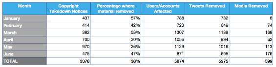 Non solo richieste di consegna dei dati. Twitter ha ricevuto un totale di 3378 takedown notice in base ai dettami legislativi del Digital Millennium Copyright Act (DMCA). Con una percentuale di rimozione del 38 per cento, con oltre 5mila micropost eliminati per aver offerto link a materiale coperto da copyright.