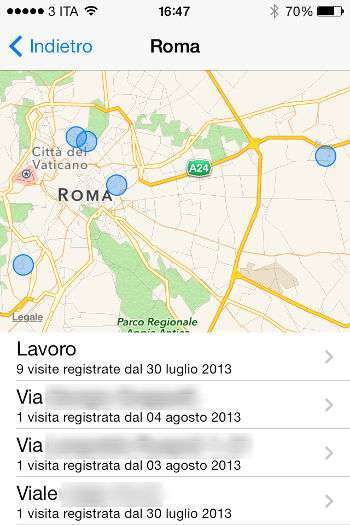 si può visualizzare una mappa come quella in figura che identifica con una precisione notevole gli spostamenti compiuti dal proprietario del terminale. Niente di nuovo, sono anni che gli strumenti come Google Now su Android fanno qualcosa di simile: ma comunque si tratta di un’epifania rivelatoria, che pone l’accento sulla quantità di informazioni che è possibile prelevare da uno smartphone da parte di tutte le applicazioni abilitate a consultare i dati sulla geolocalizzazione.