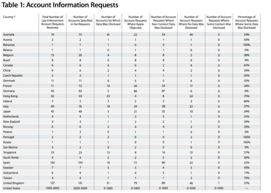 Nella tabella con i numeri che ha il permesso di divulgare, dunque, Cupertino mostra come tra gennaio e giugno 2013 abbia ricevuto solo per gli Stati Uniti tra le mille e le duemila richieste di accesso ad un totale compreso tra i duemila ed i tremila account . Non mancano poi le richieste da parte di altri stati: negli stessi sei mesi, per esempio, si parla per l’Italia di 60 richieste d’accesso che riguardano un totale di 76 diversi account.
