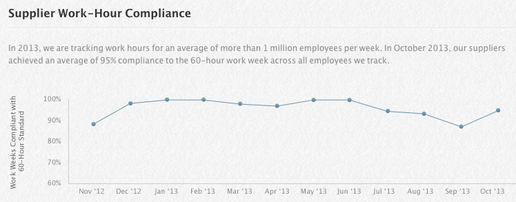Cupertino è tornata sull’argomento con l’ottavo rapporto annuale sulle responsabilità dei fornitori : l’ultimo lo aveva divulgato a gennaio e in quell’occasione aveva annunciato l’interruzione di un contratto di collaborazione con un’azienda cinese che aveva mancato di rispettare quanto prescritto dal codice di condotta per i fornitori. Apple spiega, inoltre, di aver adottato programmi di monitoraggio nei confronti di diversi suoi produttori : solo nel 2012 sono stati controllati gli orari di più di un milione di lavoratori a settimana, con dati pubblicati mensilmente e che mostrano come la media di ore lavorative sia inferiore alle 50 a settimana e che il 92 per cento delle aziende rispetta il limite imposto. Un numero di aziende in regola che arriva al 95 per cento nel 2013 .