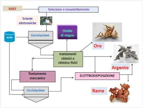 Tra queste nuove tecniche va annoverato il processo idrometallurgico di riciclaggio ideato e brevettato dall’ENEA, un insieme di trattamenti chimici, chimico-fisici e meccanici che a partire dai RAEE grezzi è in grado di recuperare oro, argento, stagno, rame, piombo e altri metalli “preziosi” da poter poi riutilizzare.