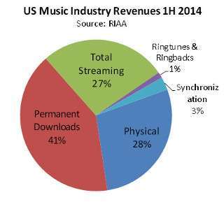 A descrivere il panorama musicale e le abitudini dei consumatori, limitatamente al mercato statunitense, è il report di RIAA dedicato ai primi sei mesi del 2014: il fatturato generale, che vale 3,2 miliardi di dollari, è in calo del 4,9 per cento rispetto alla prima metà del 2013, e la musica venduta su supporti fisici vale per il 28 per cento del fatturato (con i CD che valgono l’80 per cento della fetta, e i vinili, in crescita del 43 per cento rispetto all’anno precedente, che valgono il 16 per cento).