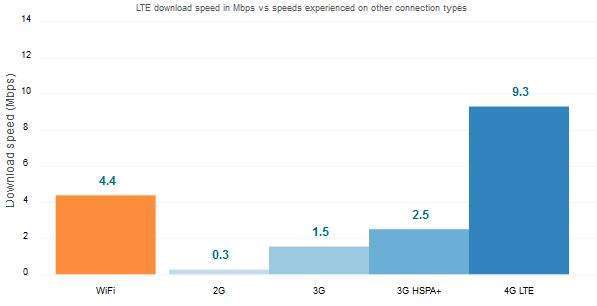 In generale le connessione mobile 4G LTE si confermano più veloci non solo rispetto alle altre tecnologie mobile come 2G, 3G e 3G HSPA+ ma anche rispetto a quanto garantito dalle connessioni in WiFi, che si ferma quasi alla metà della velocità.