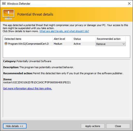Windows Defender per Windows 10 e 8.1, Microsoft Security Essentials per Windows 7 e Vista e il tool Safety Scanner individuano ora i due certificati come pericolosi e procedono alla rimozione, così come viene rimosso il plugin Dell.Foundation.Agent.Plugins.eDell.dll , che forza la reinstallazione del certificato eDellRoot . C’è chi osserva che l’azione di Microsoft potrebbe rivelarsi inutile: le macchine Dell vendute con a bordo prodotti di sicurezza di terze parti non godranno della tempestività di Redmond.