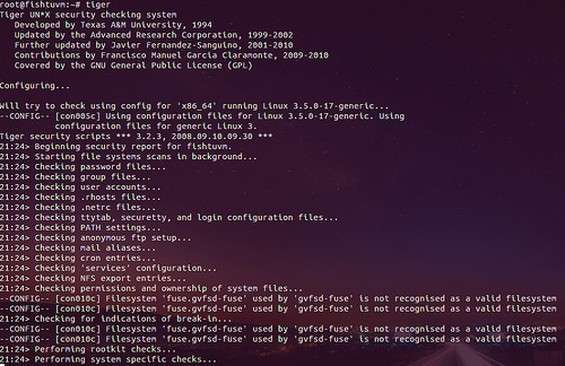Per installare Tiger nella nostra distribuzione GNU/Linux digitiamo il comando: sudo apt-get install tiger e quindi sudo tiger -H per conoscere tutte le opzioni disponibili. Tiger è installato in locale, viene eseguito come root, e controlla il localhost per problemi comuni di configurazione di sistema in materia di sicurezza. Tiger non è un monitor di rete (come ad esempio Nagios ) o un sistema di gestione dei pacchetti (come apt ). Tiger ha una serie completa di controlli incorporati ed è portatile con requisiti minimi. Esso viene eseguito come root, in modo che possa fare un’analisi molto approfondita del sistema che programmi come Nagios non riescono a fare. Al tempo stesso, Tiger è molto leggero: non ci sono demoni, database o connessioni di rete necessarie.