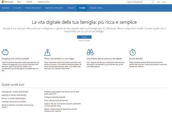 Le funzionalità per la famiglia progettate da Microsoft offrono ai genitori la possibilità di avere un controllo completo su ciò che i figli possono fare o non fare con il computer o Internet. Non occorre installare software aggiuntivi, ma solo creare un account Microsoft per ogni membro della famiglia: i genitori avranno un account Amministratore, mentre ai figli sarà associato un account limitato.