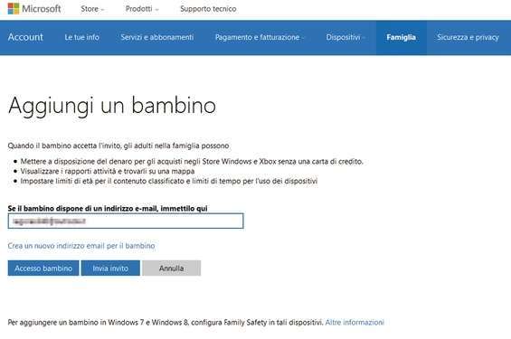 Clicchiamo poi su Aggiungi un bambino , inseriamo l’indirizzo e-mail di nostro figlio e selezioniamo Invia invito . Se il bambino non possiede un indirizzo e-mail clicchiamo Crea un nuovo indirizzo email per il bambino e seguiamo le istruzioni. Il bambino dovrà infine accettare l’invito mediante l’e-mail che riceverà.