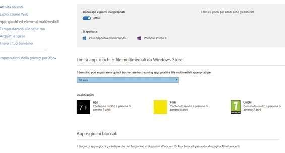 Per impedire che il bambino utilizzi applicazioni on-line o giochi con titoli non adatti alla sua età, clicchiamo App, giochi ed elementi multimediali e cambiamo l’impostazione di Blocca app e giochi inappropriati in Attivato . In Limita app e giochi selezioniamo la fascia di età appropriata.