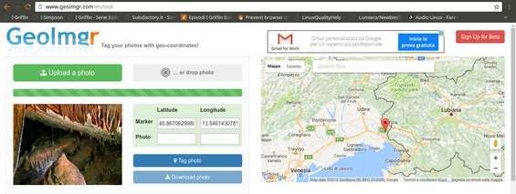 Caricata la foto ne appare un’anteprima nella pagina con le info sulla posizione GPS. La riga marker indica al posizione del punto indicato sulla mappa che si trova a destra nell’interfaccia del sito, mentre la riga photo indica l’eventuale posizione già presente nell’immagine.