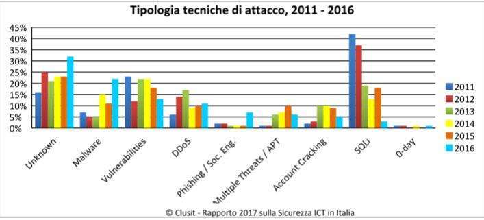 Quello che è particolarmente preoccupante, secondo lo studio, è che il 32 per cento degli attacchi viene sferrato con tecniche sconosciute : un numero che è anche la diretta conseguenza del fatto che in Europa nel 2016 non fosse ancora obbligatoria la notifica delle violazioni e dei furti di dati (lo sarà con l’ applicazione del Regolamento Europeo in materia di protezione dei dati). Inoltre preoccupa molto la crescita, addirittura a quattro cifre, degli attacchi compiuti con tecniche di phishing, che sfruttano il social engineering per carpire informazioni sensibili agli utenti e indurli a passi falsi, per poi perpetrare l’attacco informatico vero e proprio soprattutto via malware. Si tratta di una soluzione utilizzata non solo per compiere attacchi di piccola entità, tipicamente realizzati da cyber criminali poco sofisticati, dediti a generare i propri margini su grandissimi numeri, ma anche contro bersagli importanti e con impatti significativi, per esempio tramite l’ottenimento di informazioni da dipendenti di aziende. Insomma, l’anello debole è sempre più l’essere umano, come dimostra la crescita piuttosto limitata di altri attacchi (più 13 per cento per i DDoS, mentre contenuti restano quelli che sfruttano vulnerabilità 0-day).