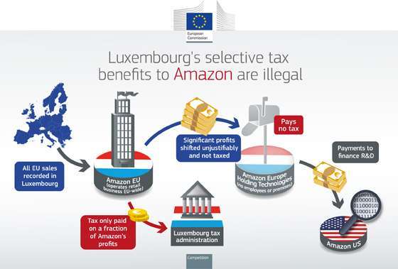 Nelle sue conclusioni , la Commissione afferma che, utilizzando lo strumento del ruling fiscale (emanato nel Lussemburgo nel 2003 e rinnovato nel 2011), Amazon ha potuto trasferire la maggior parte dei suoi utili da una società del gruppo soggetta a tassazione in Lussemburgo (Amazon EU) a una società non soggetta, Amazon Europe Holding Technologies. Il ruling fiscale ha permesso il pagamento di una royalty da parte di Amazon EU ad Amazon Europe Holding, riducendo così drasticamente gli utili imponibili di Amazon EU.