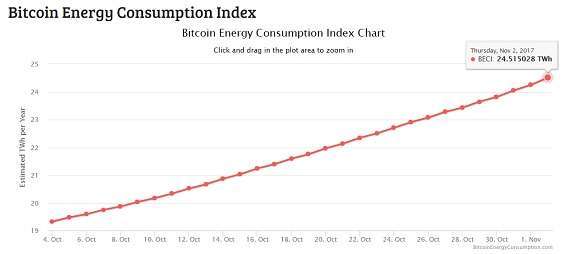 Il sito Digiconomist ha verificato il trend di consumo energetico associato alla creazione di Bitcoin nel mese di ottobre. L’incremento della criptomoneta in circolazione sembra registrare un tasso di crescita vertiginoso e costante. Il mining di Bitcoin (una sorta di “coniatura” della moneta virtuale”, che avviene risolvendo i blocchi della blockchain , è un processo che prevede calcoli impegnativi e risoluzioni di algoritmi complessi. Le macchine impiegate, messe sotto sforzo, consumano ingenti quantità di elettricità , primo vero fabbisogno necessario a garantirne la corretta diffusione. La correlazione tra diffusione della moneta virtuale e consumo energetico è quindi evidente, così come lo sono gli effetti deleteri per l’ambiente , a partire dal rilascio di anidride carbonica nell’atmosfera.