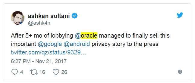 Sulla vicenda si è espresso anche Ashkan Soltani, un ricercatore e consigliere tecnologico per la Federal Trade Commission (e la Casa Bianca) che ha fatto sapere dal suo account Twitter ( @ashk4n ) che Oracle cercava da mesi di rendere nota la pratica illecita. C’è da scommettere che ci saranno ulteriori evoluzioni.