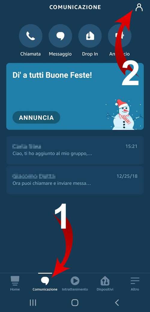 Una volta aperta l’app Alexa occorre un tap sulla voce di menu “Comunicazioni” (1), quindi sull’icona in alto a destra “Contatti” (2). Si entra così in un pannello dal quale è possibile associare i contatti della propria rubrica ai contatti di Alexa: di fatto si insegna ad Alexa quali siano le chiamate possibili istruendo una rubrica apposita a partire da quella già esistente sul proprio smartphone.