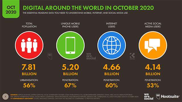 Oltre la metà della popolazione mondiale è iscritta e attiva sui social network: più di quattro miliardi di persone (4,14 miliardi per l’esattezza, +12% in un anno) stando a quanto rivela lo studio Digital 2020 October Global Statshot Report condotto da Hootsuite e We Are Social. La quota cresce di circa due milioni di unità ogni giorno.