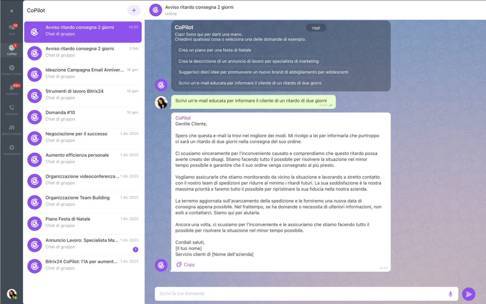 - Facilità d’uso: Integrato in ogni sezione di Bitrix24, CoPilot è facilmente accessibile e semplice da utilizzare, rendendolo accessibile a tutti gli utenti.