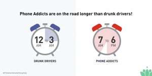 Secondo l’AAA Foundation for Traffic Safety, il maggior numero di conducenti ubriachi è in viaggio tra mezzanotte e le 3 del mattino. I dati mostrano che i dipendenti del telefono sono sulla strada ad ogni ora del giorno, con ore di punta durante il periodo in cui la maggior parte della gente è in viaggio, tra le 7:00 e le 18:00.