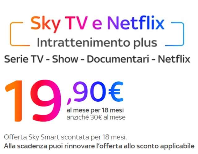 L’offerta Sky TV e Netflix (Intrattenimento Plus) è disponibile online su questa pagina a soli 19,90€ al mese per 18 mesi anziché 30€ al mese.