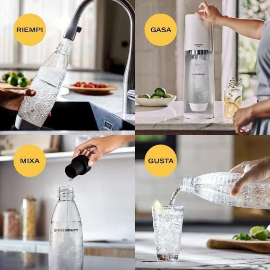 Il funzionamento è semplice e veloce: basta avvitare il cilindro di gas al dispositivo, riempire la bottiglia d’acqua fino alla linea indicata, inserire e premere il pulsante per riempirla di bollicine. In pochi secondi, avrai una bevanda frizzante e rinfrescante pronta da gustare. Come puoi vedere basta veramente poco ed è facilissima da usare.