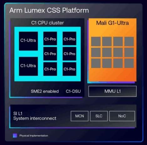 La seconda novità di rilievo della piattaforma Lumex è rappresentata dalle GPU della serie Mali-G1. Mali-G1 Ultra offre prestazioni di livello desktop fino a 2 volte quelle della Immortalis-G925 nel ray tracing e fino al 20% superiori nel gaming e nell’inferenza dei modelli AI. È possibile integrare un numero di core tra 10 e 24. Ci sono anche le Mali-G1 Premium e Mali-G1 Pro.