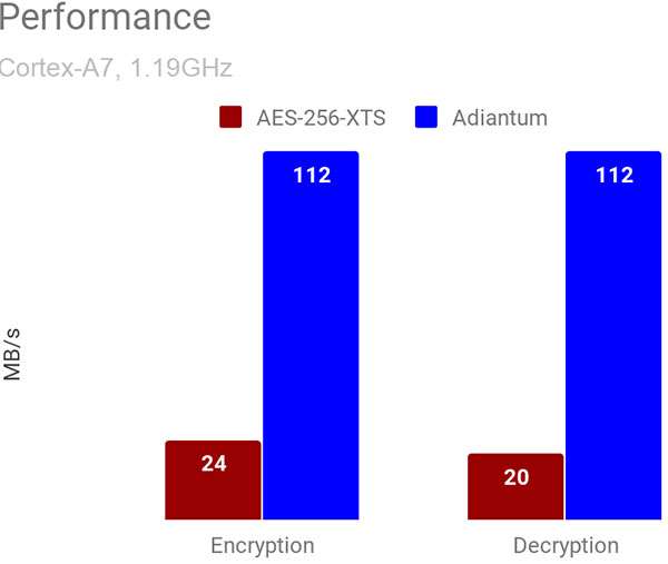 Adiantum fa leva sul metodo crittografico di ChaCha già impiegato in ambito Web, offrendo un adeguato livello di sicurezza senza compromettere le prestazioni del comparto hardware. Di seguito un estratto dal sito ufficiale del progetto e grafici che mostrano come le performance tra AES e Adiantum sostanzialmente si equivalgano su Cortex-A7.