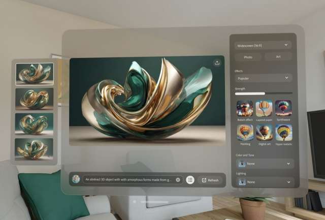 Adobe Firefly può essere utilizzato tramite interfaccia web o all’interno delle applicazioni di Adobe, tra cui Photoshop. L’app per Vision Pro è stata sviluppata per sfruttare al meglio l’interfaccia utente di visionOS. Gli utenti possono già vedere ambientazioni virtuali durante l’uso del visore (in vendita da oggi negli Stati Uniti). Grazie a Firefly è possibile abbellire lo spazio reale con immagini generate dal modello di Adobe.