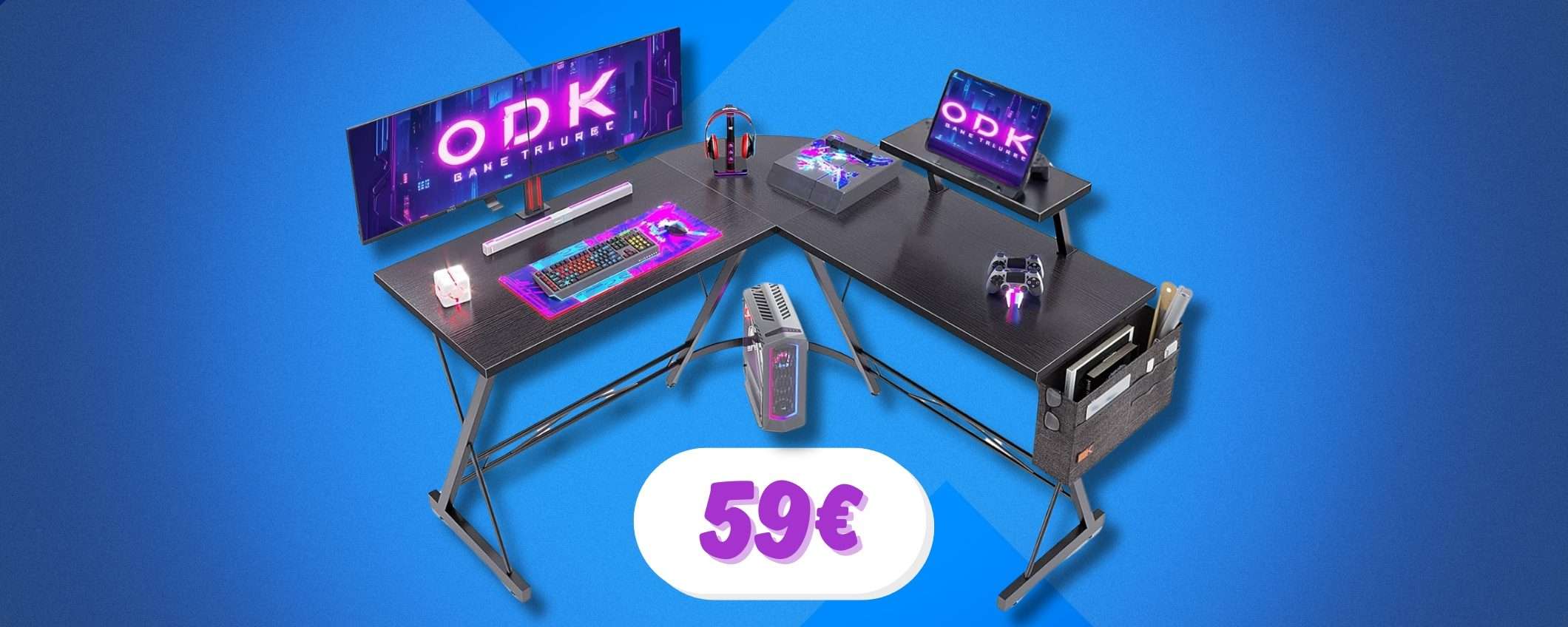 Questa scrivania ODK viene pubblicizzata come la scrivania perfetta per il gaming ma lasciati dire che va bene anche per la tua postazione da smart working. Questo perché ha a disposizione tanto spazio e un piano di appoggio infinito per sistemare console ma anche computer fissi, monitor, laptop e così via. Ci puoi mettere sopra persino la stampante così da non rilegarla in qualche altro angolo della tua casa. Disponibile in colorazione nera, il sistema è angolare con una dimensione di 127×127 centimetri e una profondità di 47 centimetri per lato risultando compatta ma allo stesso tempo ideale per qualunque spazio.
