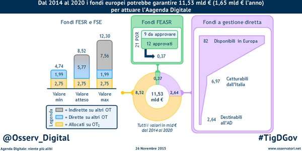 D’altra parte dieci regioni hanno già formalizzato i necessari piani operativi necessari all’ottenimento di tali fondi e altre 8 li stanno completando : se tutto andrà come previsto, dal 2014 al 2020 le regioni italiane avranno (teoricamente) a disposizione 5,7 miliardi di euro da risorse FESR e FSE per attuarli, a cui – secondo l’Osservatorio – potrebbero essere aggiunti altri 5,8 miliardi di euro includendo investimenti in digitale nei programmi operativi scritti con riferimento ad altri obiettivi tematici ed altri 372 milioni di euro dovrebbero arrivare dal Feasr. Inoltre, grazie a fondi europei a gestione diretta, come i fondi del programma europeo Horizon 2020, dal 2014 al 2020, continua ancora l’analisi, saranno disponibili per l’attuazione dell’Agenda Digitale 2,6 miliardi di euro, pari a 376 milioni di euro l’anno.