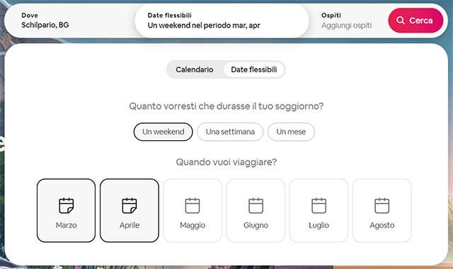 Per capire di cosa si tratta è sufficiente dare uno sguardo allo screenshot di seguito. Quando ci si appresta ad eseguire la ricerca, a fianco del tradizionale calendario in cui specificare il giorno esatto di arrivo e quello di partenza compare la voce “Date flessibili”. È possibile selezionare la durata del soggiorno tra le opzioni “Un weekend”, “Una settimana” o “Un mese”, indicando poi i mesi.