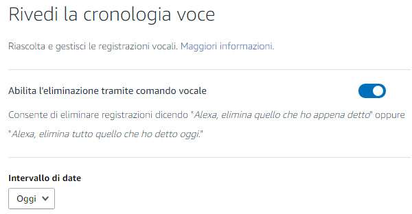 Quando questa opzione è abilitata, chiunque abbia accesso ai tuoi dispositivi può chiedere ad Alexa di eliminare le registrazioni vocali dal tuo account dicendo “Alexa, elimina quello che ho appena detto” oppure “Alexa, elimina tutto quello che ho detto oggi”.