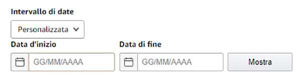 Il menu a tendina “Intervallo di date” offre le seguenti opzioni: Oggi, Ieri, Questa settimana, Questo mese, Intera cronologia, Personalizzata. Selezionando l’ultima è possibile specificare la data di inizio e quella di fine del periodo.
