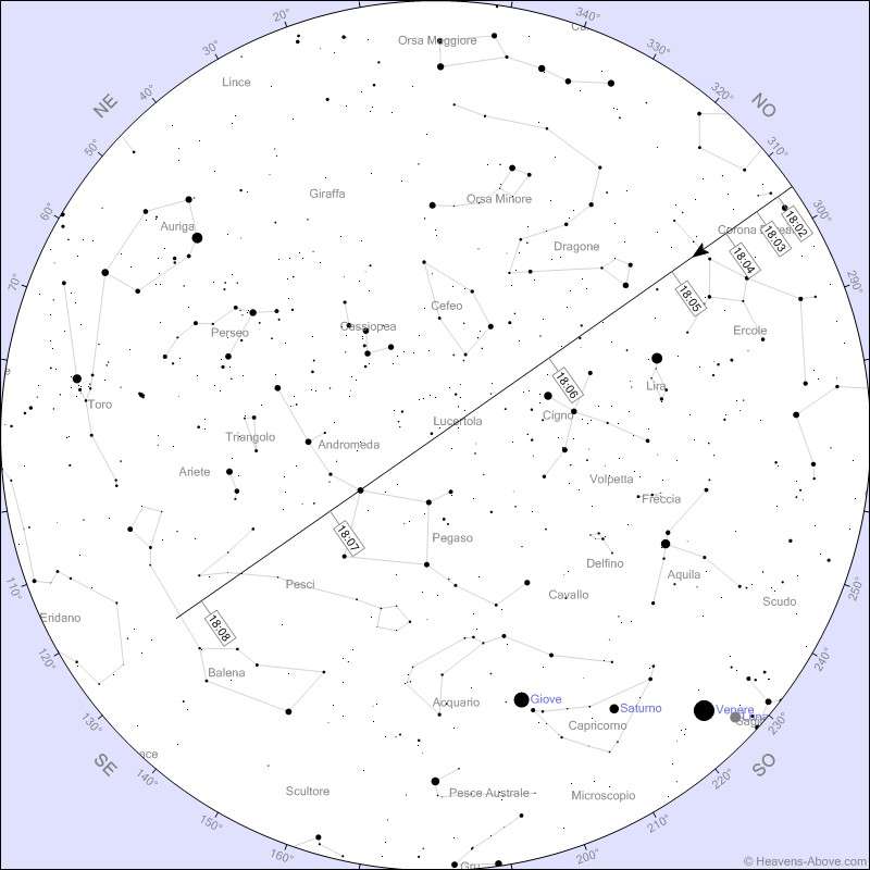 Questa sera nei cieli italiani c’è uno spettacolo particolare da poter osservare. Nella direttrice che va dal Dragone alla Balena, tra il Cigno e Andromeda, Pegaso e Pesci, ci sarà infatti un passaggio della Stazione Spaziale Internazionale (ISS) ben visibile da tutta Italia. Complice un meteo non completamente favorevole, la traiettoria sarà visibile soprattutto al Nord, mentre dal Lazio alla Sicilia saranno in pochi ad avere un fortunato varco tra le nubi.