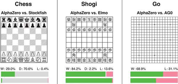 È un algoritmo studiato per evolvere le proprie capacità mediante tecniche di apprendimento automatico, impiegando il metodo MCTS per migliorare nel tempo le proprie abilità e pianificare le mosse da compiere. Il banco di prova scelto per testarne l’efficacia è ancora una volta quello del tavolo da gioco: i suoi autori l’hanno fatto competere con le intelligenze artificiali destinate in modo specifico agli scacchi, al shogi (una variante giapponese) e alla disciplina Go. In tutti i casi è uscito a testa alta dal confronto, battendo nella maggior parte dei match i programmi Stockfish, Elmo e il già citato AlphaGo. Nei grafici di seguito, in verde sono riportate le vittorie di AlphaZero, in grigio le partite terminate con un pareggio e in rosa le sconfitte.
