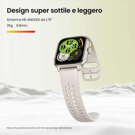 Bello, colorato ma soprattutto ottimo in tutto e per tutto. Non solo è robusto e resistente ma ti fa mettere al polso un accessorio che ne valga la pena e che di limiti ne conosce ben pochi. Con un design intrigante, il display AMOLED brilla di luce propria e soprattutto puoi leggere le notifiche e i dati con una sola occhiata.