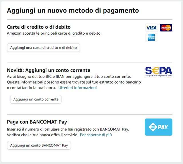 Se si desidera aggiungere BANCOMAT Pay come metodo di pagamento per gli acquisti effettuati attraverso l’e-commerce italiano di Amazon, su computer è sufficiente autenticarsi, accedere alla sezione “Il mio account” e poi alla voce “I miei pagamenti”. Lì è poi sufficiente selezionare la voce “Aggiungi un metodo di pagamento” e seguire le istruzioni mostrate.
