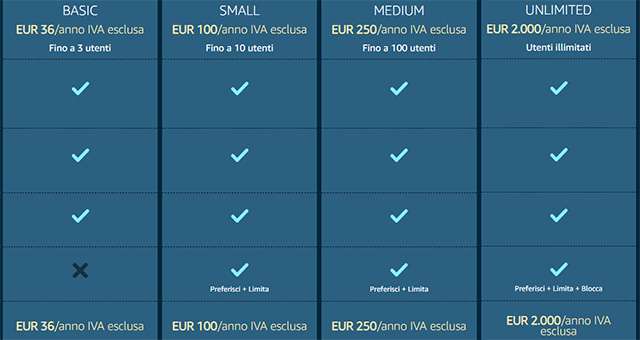 Di seguito le diverse formule proposte da questa nuova offerta di Amazon Prime rivolta alle aziende: si va da Basic (36 euro + IVA all’anno) a Unlimited (2.000 euro + IVA all’anno) passando per Small e Medium, ognuna con le proprie caratteristiche.