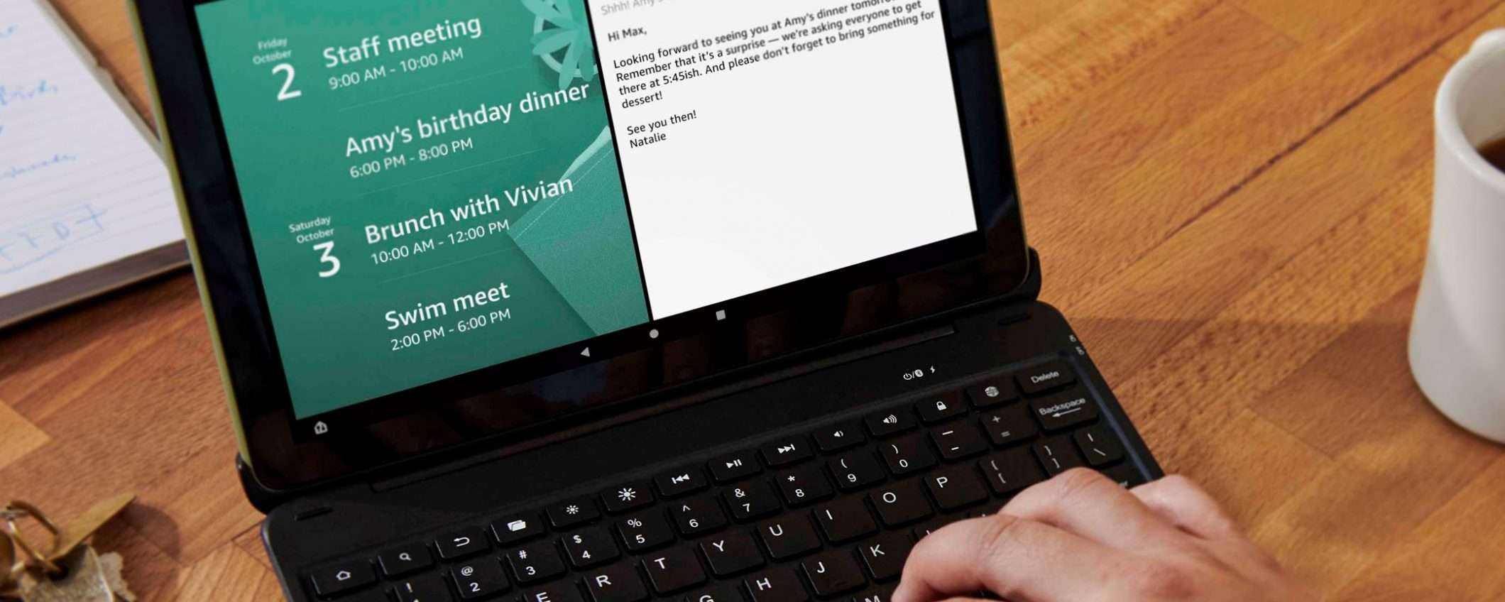 - Split screen: funzionalità completamente nuova per Fire OS che mostra due app compatibili, come ad esempio Messenger di Facebook e Prime Video, aperte contemporaneamente, fianco a fianco. Si possono, infatti, visualizzare gli account social mentre si guarda un film, effettuare una videochiamata su Zoom durante l’invio di un messaggio o prendere appunti in OneNote mentre si legge un eBook Kindle.