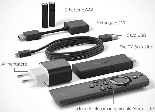 Nell’immagine qui sopra il contenuto della confezione (il cavo USB serve per alimentare Fire TV Stick Lite, le due batterie AAA per il telecomando). Oggi hai la possibilità di acquistare il prodotto al prezzo di soli 19,99 euro, ma l’offerta di Amazon è limitata nel tempo: approfittane prima che torni a 29,99 euro come da listino. Se non ti accontenti del Full HD, anche la versione 4K è in sconto.