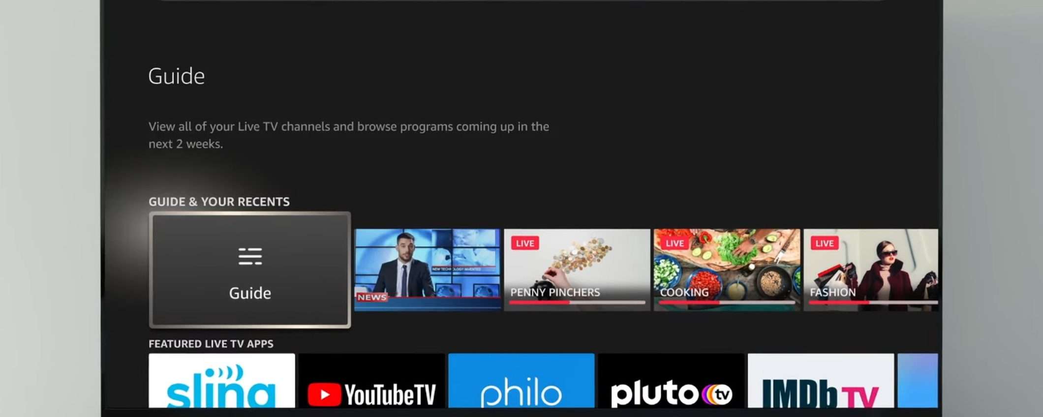 Premendo il pulsante dedicato sul telecomando (quello con il simbolo della TV) viene aperta la guida dei canali nella scheda Live (In diretta). Ovviamente è possibile chiedere ad Alexa di aprire la guida, sintonizzare un canale o avviare la riproduzione di uno specifico contenuto. Le app supportate sono: YouTube TV, Prime Video Channels, IMDb TV, Hulu + Live, Discovery+, Pluto TV, Sling TV, FOX Now, Tubi, Philo, Red Bull TV, Plex, ESPN, Haystack News e Xumo.