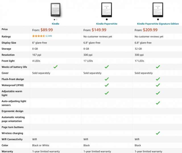 La tabella mostra il Kindle di decima generazione accanto ai nuovi Kindle Paperwhite di quinta generazione. Diverse caratteristiche sono rimaste invariate: design con schermo a filo, certificazione IPX8 (resistenza all’acqua) e durata della batteria. La prima novità è rappresentata dalla diagonale dello schermo, incrementata da 6 a 6,8 pollici (risoluzione di 300 ppi). Il numero di LED per la luce frontale è invece aumentato da 5 a 17 e la tonalità è regolabile (come nel Kindle Oasis).