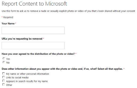 Microsoft prevede uno specifico form online per la segnalazione da parte degli utenti di Bing, Xbox Live e OneDrive i contenuti frutto della violazione della loro intimità e della loro immagine.
